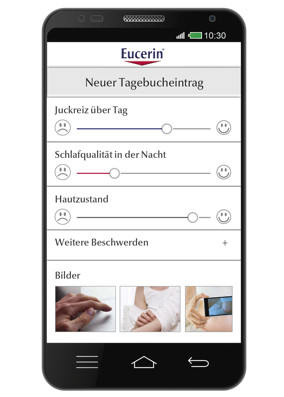 Unkompliziert und intuitiv: Neurodermitis ist vor allem – Gefühlssache. Deshalb bietet Eucerin® AtopiCoach die Möglichkeit, den Juckreiz, die Schlafqualität und den Hautzustand subjektiv zu bewerten und auf einer Skala einzutragen. Natürlich ist auch noch Platz für individuelle Beobachtungen und Eindrücke, z. B. Angaben über klimatische Einflüsse, Ernährung usw. Und die im Fotoalbum gespeicherten Aufnahmen machen den Krankheitsverlauf sichtbar und erlauben dem Arzt eine objektive Rückschau und eine gezielte Therapie.
